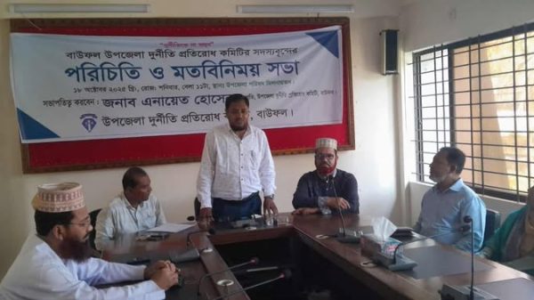 বাউফল (পটুয়াখালী) প্রতিনিধিঃ “দুর্নীতিকে না বলুন”, এই স্লোগানকে সামনে রেখে পটুয়াখালীর বাউফলে উপজেলা দুর্নীতি প্রতিরোধ কমিটির নব নির্বাচিত সদস্যদের পরিচিতি ও মতবিনিময় সভা অনুষ্ঠিত হয়েছে। শনিবার (১৮ অক্টোবর) বেলা ১১